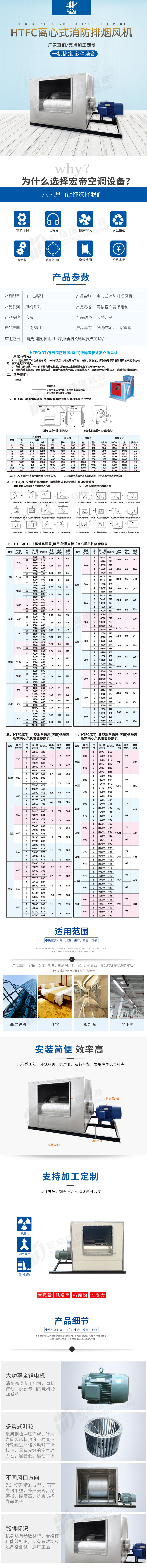 HTFC离心式消防排烟风机具有耐高温性能优良、效率高、体积小,安装简便(水平、垂直、吊装均可)等优点,广泛应用于高层建筑、烘房、地下车库、地铁、隧道等场合消防排烟和送排通风。