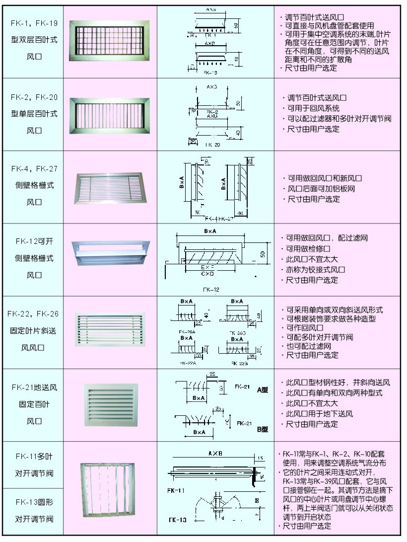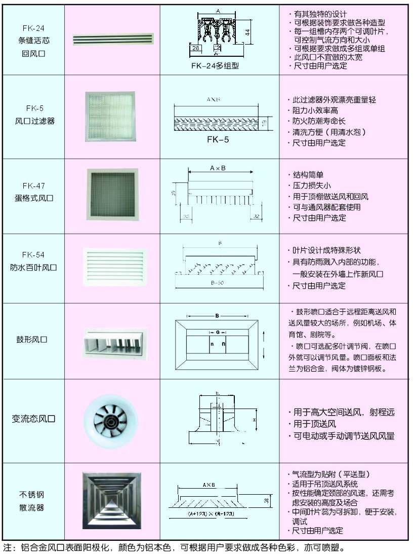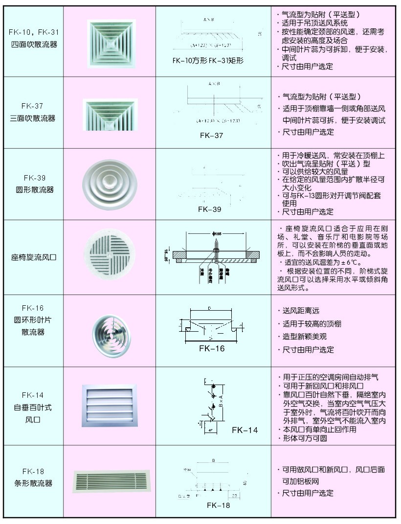 用于冷暖送风,常安装在顶棚上,吹出气流呈贴附(平送)型)可以供给较大的风量,尺寸由用户选定。