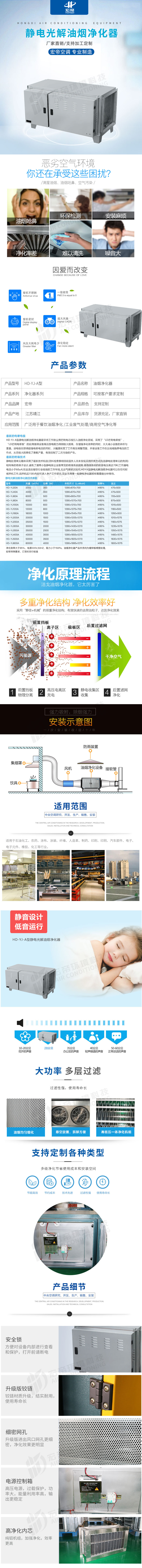 15961077156HD-YJ-A型静电光解油烟净化器采用支流叠加脉冲等离子电源和齿板结构电场组合形成,产生电晕放电,从而获得高能等离子体。厨房油烟在等离子场的作用下,使小颗粒油滴瞬间凝聚成大颗粒而被收集在油板上,并在等离子体的轰击下沉降到集油槽内。